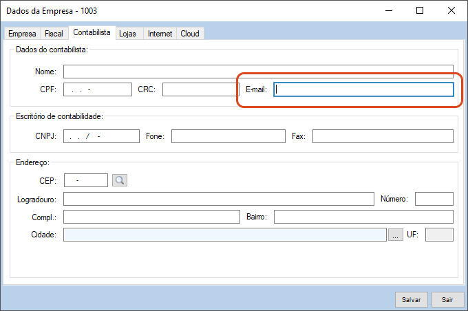 4. Preencha o campo E-mail com o endereço de e-mail da Contabilidade.
