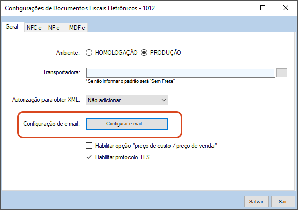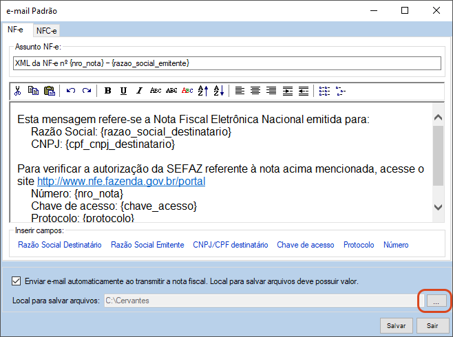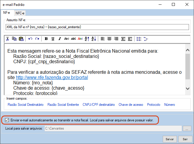 Observação: O sistema já traz um modelo de e-mail padrão, que pode ser editado tanto para NF-e quanto para NFC-e. Aqui é possível alterar: