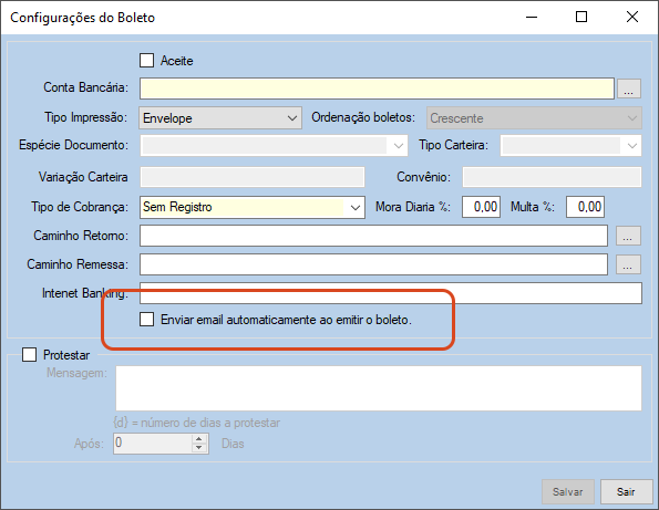 3. Na janela "Configurações do Boleto" marque a opção Enviar e-mail automaticamente ao emitir o boleto.
